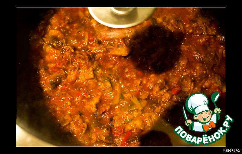 Насладились вдоволь парами алкоголя, поднимающимися над сковородкой? Ну тогда можно добавлять последние продукты: помидорки (ессесно, без кожицы и семечек) и красный острый перец.