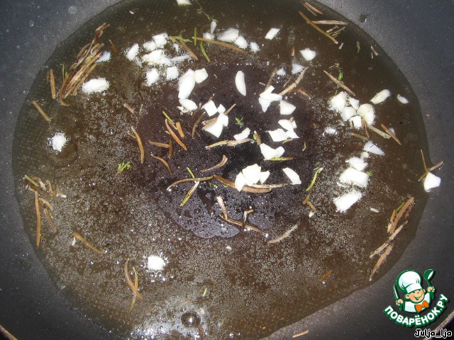 На сковороде разогреть масло. Чеснок мелко нарезать, добавить в разогретое масло. К чесноку добавить розмарин. Обжаривать вместе до появления характерного аромата.