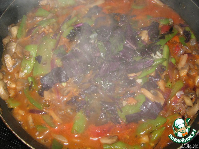 И горстку базилика. Режем или рвём руками. Накрываем крышкой и оставляем на медленном огне на 5-7 минут.