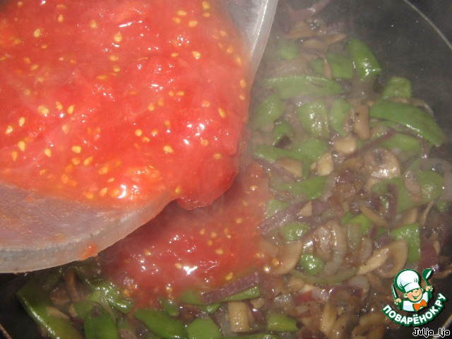 С помидоров снимаем кожицу (надрезаем крест-накрест, ошпариваем), очень мелко нарезаем или измельчаем в блендере (натираем на тёрке). Добавляем в сковородку.