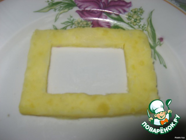 Выложить на тарелку картофель.Придать форму прямоугольника.Загладить поверхность.Это"монитор".