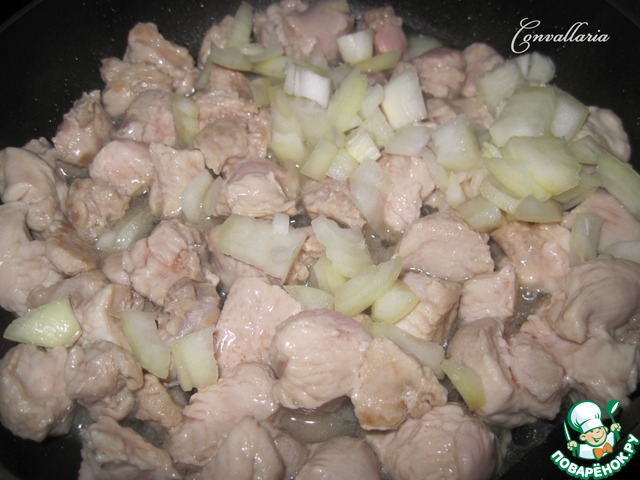 Филе грудки индейки промыть, нарезать небольшими кубиками и обжарить на растительном масле с добавлением нарубленного репчатого лука.