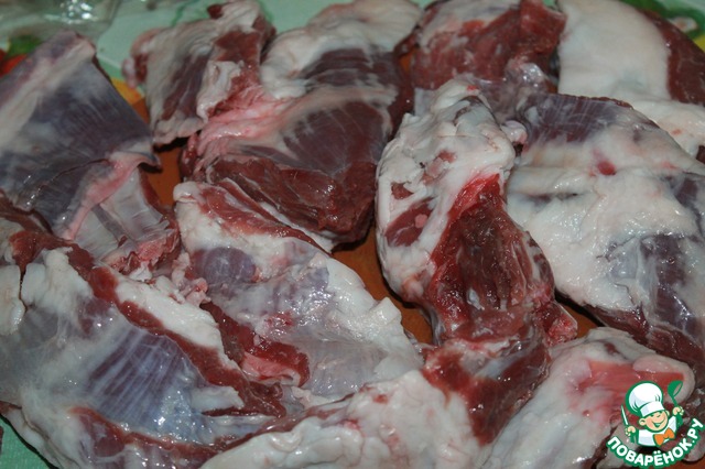 Бараньи ребрышки нарезаем кусочками в каждом по 2 - 3 ребрышка. На ребрышках оставляем немного жира. Моем в теплой воде. Обсушиваем салфеткой. Солим и перчим по вкусу. Оставляем на несколько минут.
