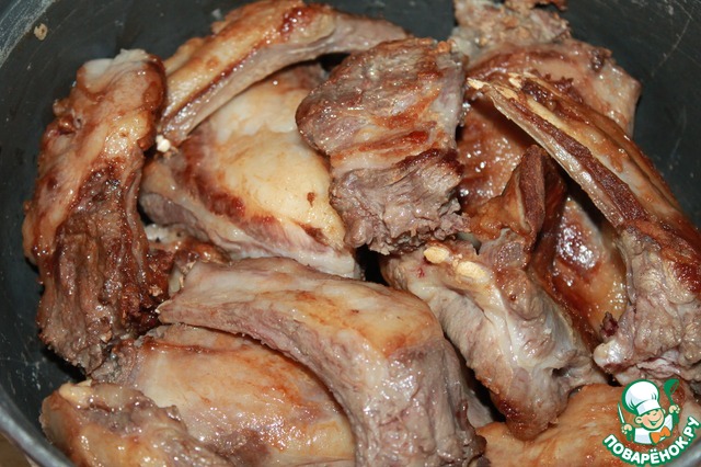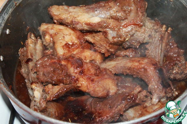 Перекладываем наши ребрышки в кастрюлю с толстым дном, это может быть и казан если вы готовите на природе. Можно оставить и на сковороде.
