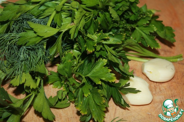 Чеснок и зелень нарезаем. У меня не оказалось базилика, очень советую попробовать с ним.
