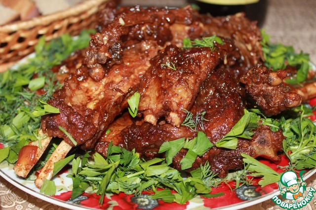 Чеснок добавляем в конце приготовления. Перемешиваем с ребрышками и оставляем под закрытой крышкой на несколько минут, без огня. После чего наши ребрышки выкладываем на большую тарелку и посыпаем зеленью.