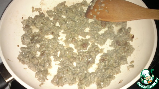 На сковороде обжарим фарш, добавив в него лук, чеснок (до готовности).