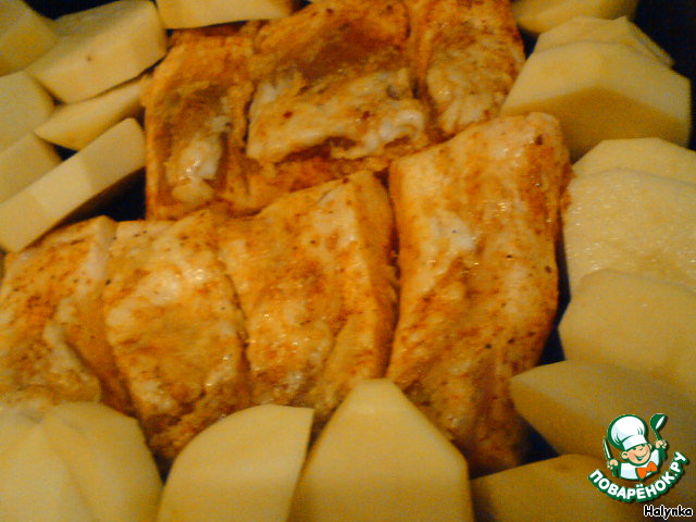 Сало выкладываем в серединку противня и обкладываем со всех сторон картофелем. Если крупные клубни - нарезать, а совсем мелкие лучше вообще не чистить, только хорошо вымыть.