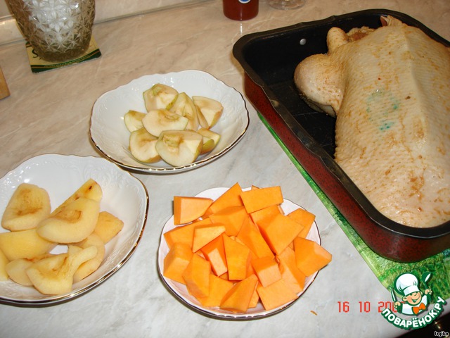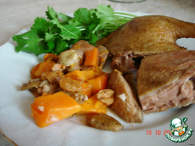 | Вот уж что действительно удивит ваших гостей, так это утка, запеченная с тыквой и сладкими фруктами. Айву можно заменить на курагу с изюмом или чернослив с орехами. Утка отлично сочетается со сладковатыми фруктами. На конкурс "Яркое настроение". |