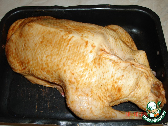 Начинкой наполнить тушку, зашить или заколоть. В форму на дно налить немного горячей воды и положить туда утку.