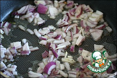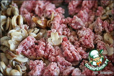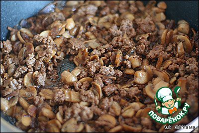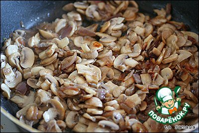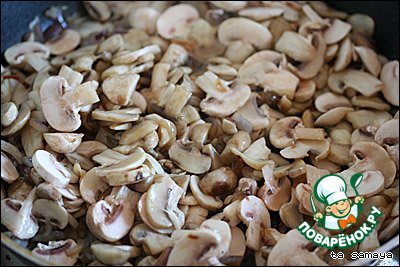После того, как лук зазолотился, кидаем на сковородку шампиньоны.