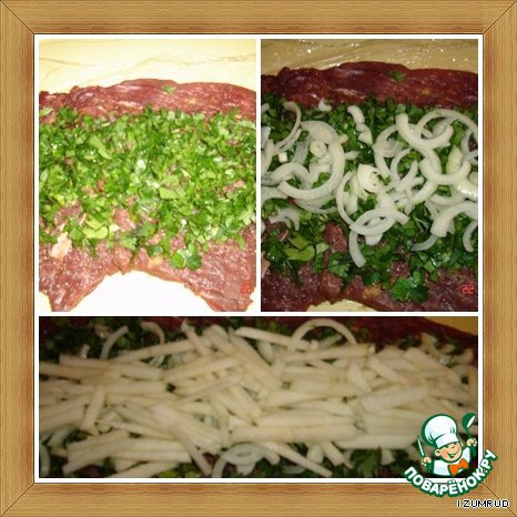 первый слой на мясо выкладываем мелко нарезанную петрушку