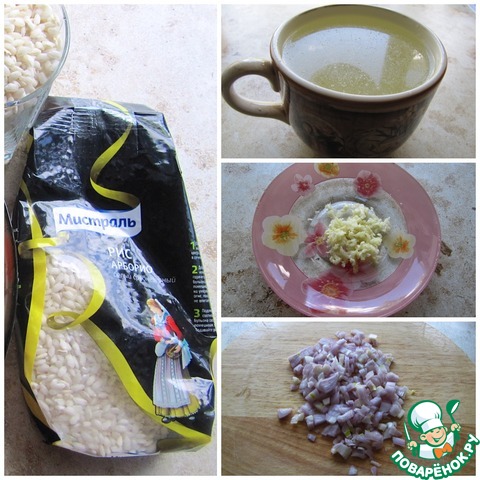 Для приготовления ризотто использую рис белый среднезерный «Арборио» от Мистраль, мыть его не нужно! Подготовить ингредиенты: бульон процедить, чеснок продавить через пресс, лук мелко покрошить.