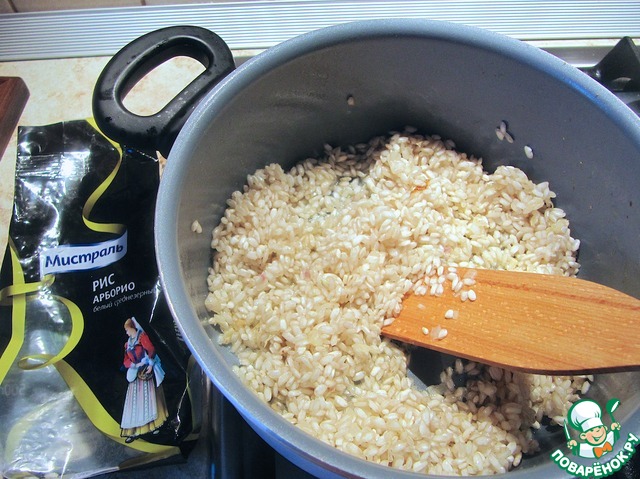 В сотейнике растопить сливочное масло, затем добавить к нему оливковое. На медленном огне обжарить-притомить мелко нарезанный лук до прозрачности. Затем добавить к нему сухой рис. Ризотто нужно постоянно помешивать.