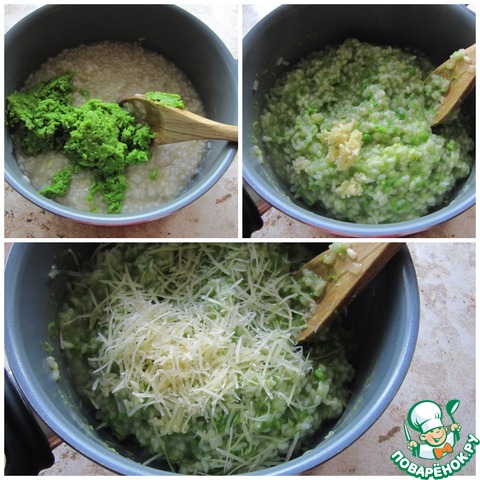 В конце приготовления добавить пюре из зеленого горошка, перемешать, чеснок, тертый пармезан, перемешать и немного прогреть. Выкладывать в тарелки и украсить яйцом-пашот. По желанию можно положить кусочек масла.
