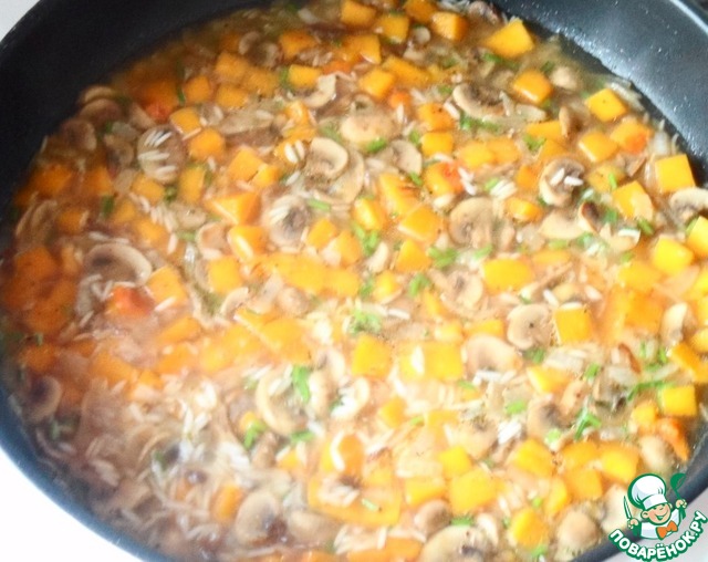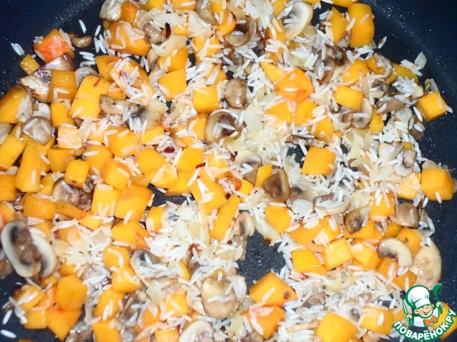Разогрейте в сковороде растительное масло на среднем огне. Нарежьте лук, выложите в сковороду, добасьте чеснок (выдавленный через чеснокодавку) и обжарьте 3-4 минуты. Выложите в сковороду тыкву и грибы, потушите около 5 минут.