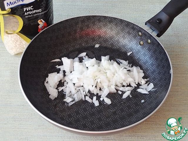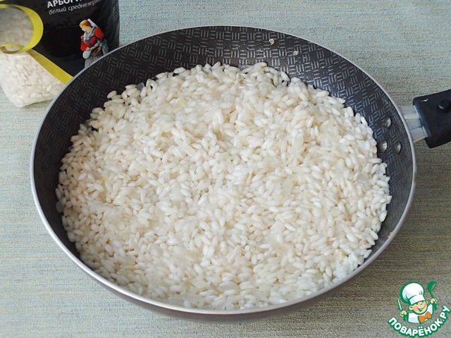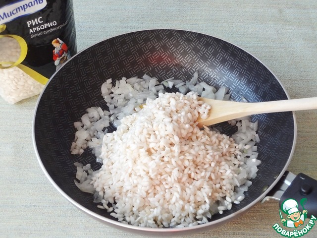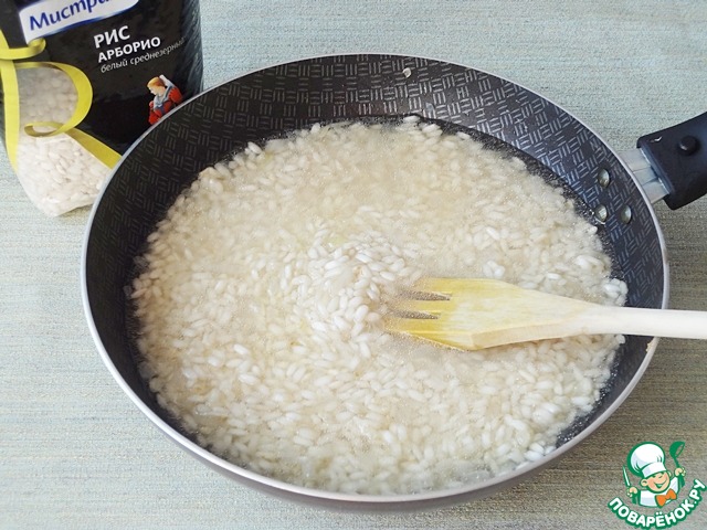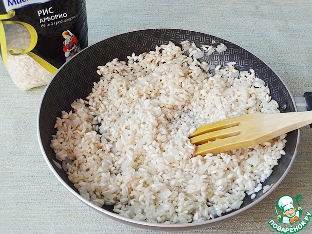 Добавьте промытый рис и помешивайте деревянной ложкой, пока зерна не станут прозачными и не впитают бОльшую часть масла. В этом блюде я использую рис Арборио ТМ Мистраль.