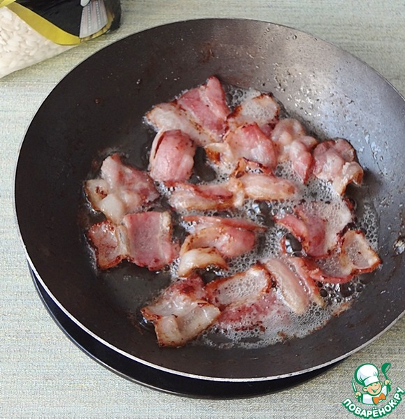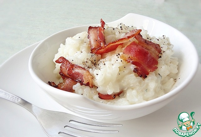 Посыпьте перцем. Сверху разложите бекон и сразу подавайте. Поверьте, это обалденно вкусный вариант ризотто!