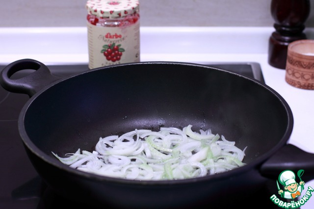 На растительном масле обжарить до золотистости нарезанный полукольцами репчатый лук.
