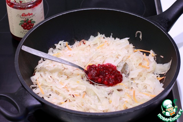 Добавить брусничный соус, перемешать, выровнять на соль, сахар, перец. В зависимости от кислоты капусты сахара может понадобиться больше или меньше. Я не добавляла вообще, мне хватило сладости соуса.