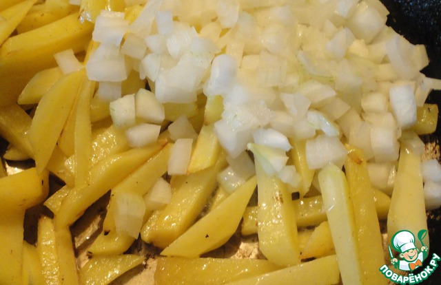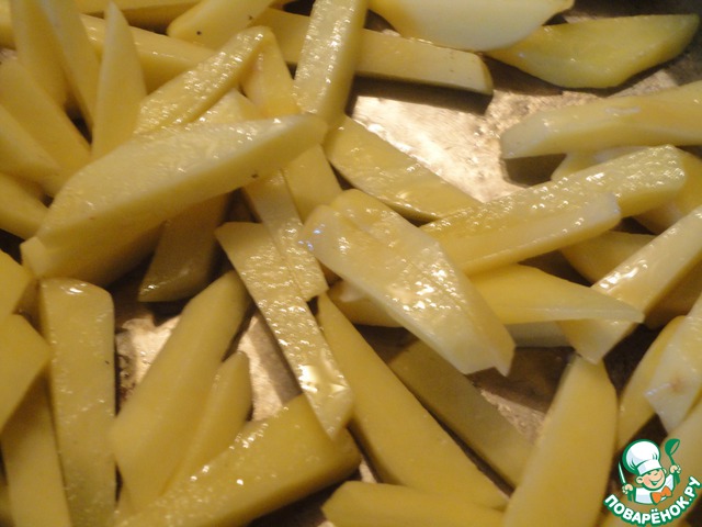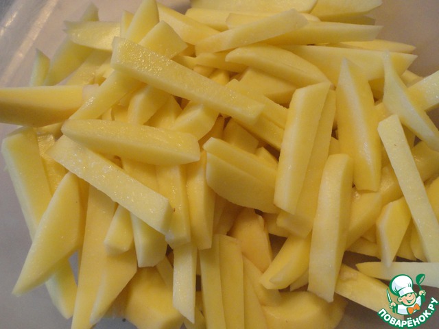 Картофель в разных рецептах прдлагалось порезать по разному: соломкой, пластинами, кубиками. Я выбрала соломку.