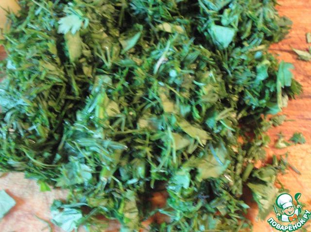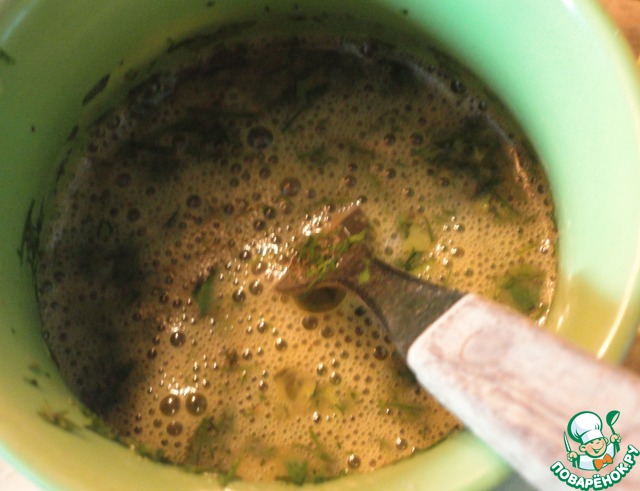 Яйца сбиваем вилкой с добавлением щепотки соли, свежемолотого черного перца и рубленой зелени.