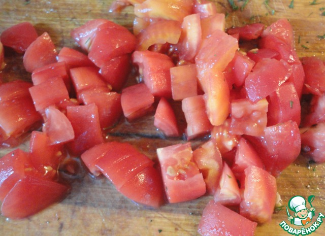 Чеснок мелко рубим ножом. Помидоры надрезаем крестообразно, заливаем кипятком на 1-2 минуты. Снимаем шкуру. Перец чили режем соломкой. Если не хотите сильно острого или готовим для детей - чили не добавляем.