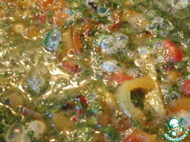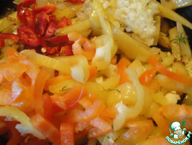 Добавляем перец. Болгаский и чили, а также чеснок. Перемешиваем и жарим вместе около 5 минут.