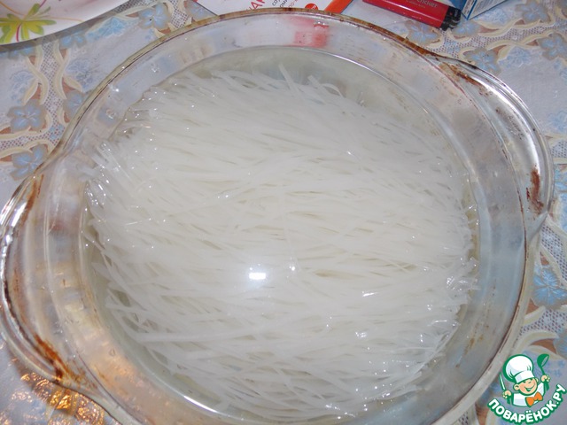 Рисовую лапшу замочить в воде комнатной температуры на 15 минут. Пока лапша размокает, нарезаем овощи соломкой и обжариваем на под. масле (чуть-чуть подсолив). Как прошло 15 минут сливаем воду и заливаем лапшу кипятком еще минут на 5, затем сливаем воду.