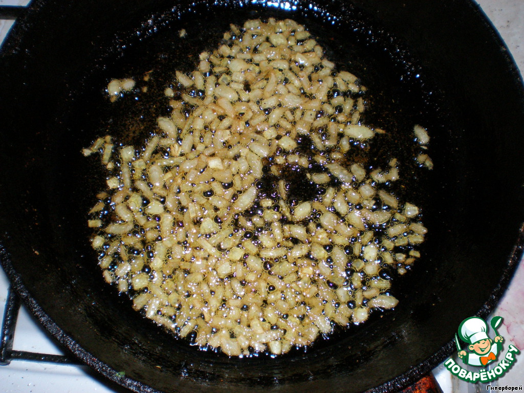 На разогретую сковороду вливаем растительное масло (2-3 ст.л.) и хорошенько разогреваем. Затем добавляем чайную ложку карри. Как только по кухне распространится аромат, добавляем нарезанный кубиками репчатый лук и поджариваем на среднем огне до золотистого цвета.