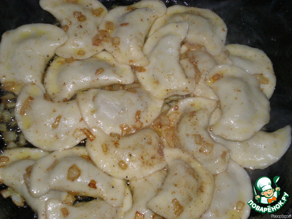 Теперь выкладываем на сковороду готовые вареники и слегка поджариваем их, время от времени помешивая.