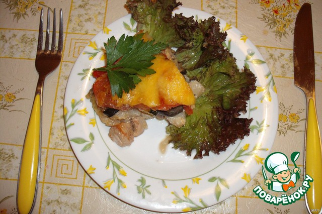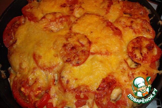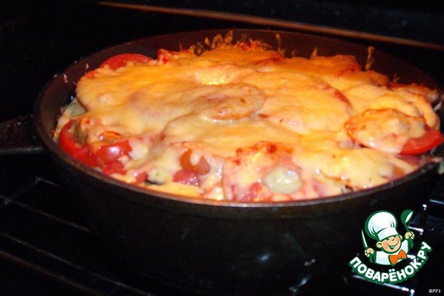 Последний слой - помидоры и сыр. Сфотографировать я забыла, на фото - вид из духовки. Вот такая "сиротская" жаровенка запекалась минут 30