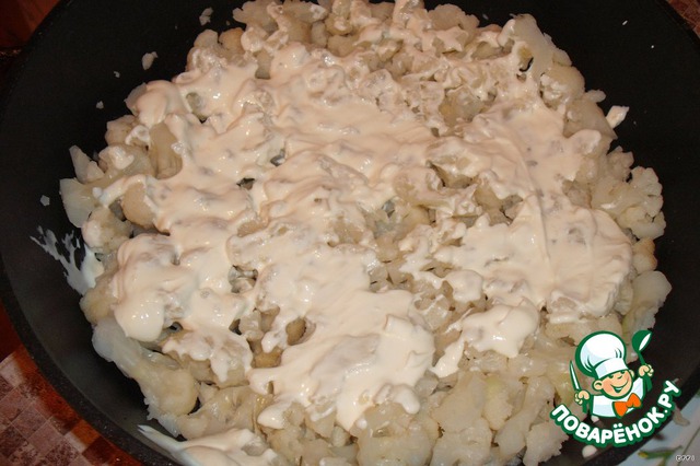Остывшую капусту делим на соцветия, выкладываем в жаровню и слегка смазываем сметаной