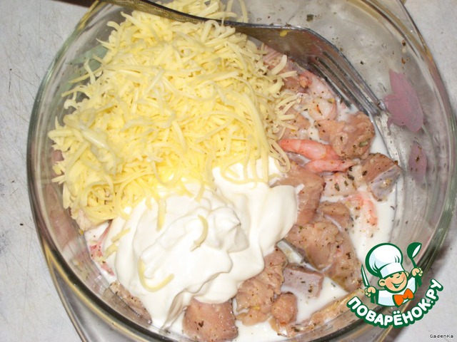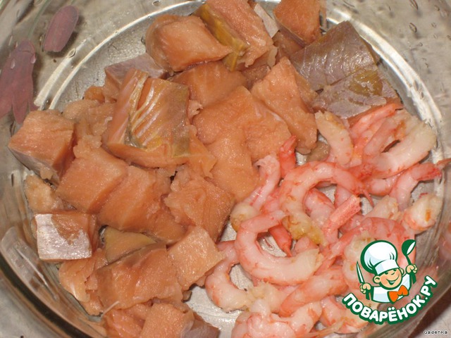 Рыбу порезать на кусочки, смешать с очищенными креветками, полить соком лимона, посолить, поперчить, добавить приправу, все перемешать и дать постоять 10 минут.