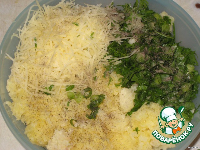 Пармезан натереть на мелкой терке и смешать с картофелем.