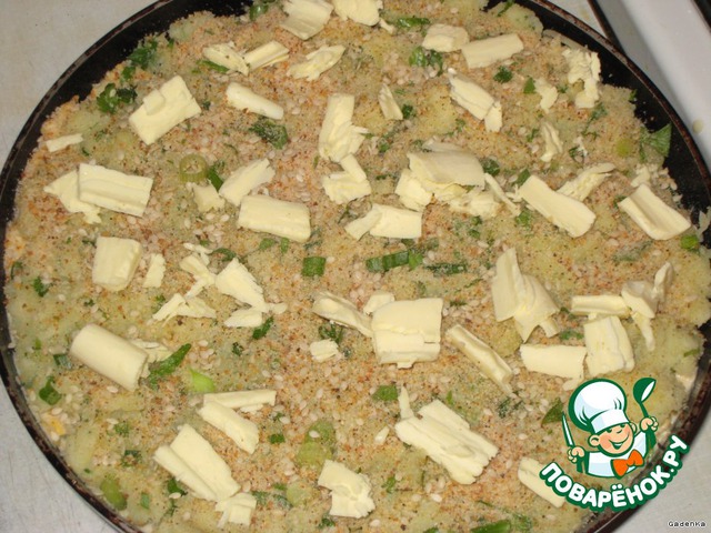 Поверх выложить остальной картофель. Посыпать панировочными сухарями и кунжутом.