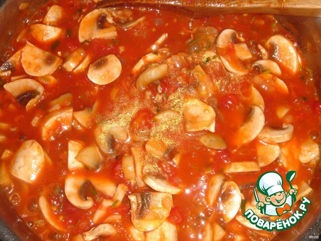 Влить бульон, очищенные и порезанные консервированные помидоры, довести до кипения, уменьшить огонь и добавить оставшиеся грибы. До сих пор не могу понять, почему грибы добавляются в два захода, но уже несколько раз делала и соблюдаю указания в рецепте:)