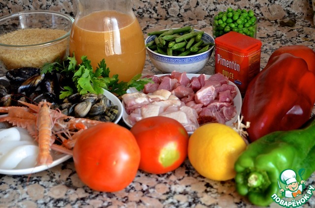 Другие важные ингредиенты: оливковое масло (холодного отжима, с мягким вкусом), шафран и сладкая паприка. Паэлья может быть рыбная, мясная, овощная или смешанная – тут огромный простор для фантазии. Чаще всего испанцы добавляют грибы, артишоки, стручковую фасоль, улиток, креветки, каракатицу, кальмара, мидии, кролика, свинину, курицу в разных сочетаниях. Далее приводится рецепт паэльи с морепродуктами и мясом – Paella al estilo mar y tierra (паэлья в стиле «Море и земля»