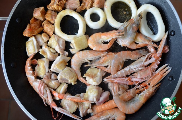 1. В сковороде разогреть оливковое масло и обжарить кусочки мяса, креветки и каракатицу минуты 2 с каждой стороны и убрать на тарелку.