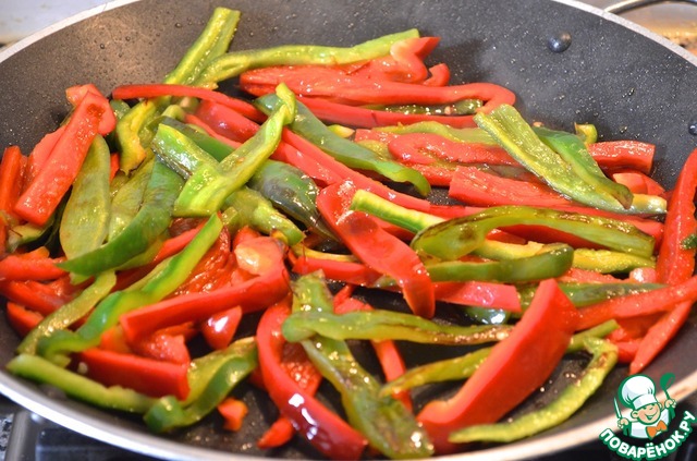 2. Для софрито: в соках, оставшихся от мяса и рыбы, потушить полоски зеленого и красного перца.