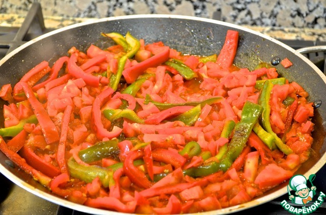 3. С помидоров снять шкурку, удалить семена, порубить их на кубики и добавить к перцу, добавить соль и черный перец. Тушить на медленном огне, помешивая, до мягкости, минут 10. Ближе к концу готовки добавить щепотку шафрана и пол-чайной ложки паприки.