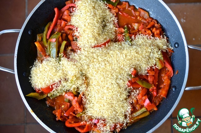 Главные элементы паэльи широкая неглубокая сковорода, рис, впитывающий жидкость (короткозерный белый, например, арборио, но ни в коем случае не длиннозерный) и хороший бульон. На стакан риса идет примерно 2 - 2 ½ стакана бульона. Бульон добавляется в рис горячим.