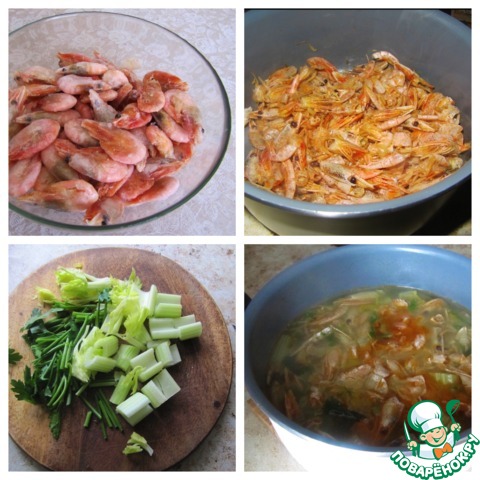 Креветки постепенно разморозить в холодильной камере, очистить от панцирей и голов, удалить кишечную вену. (Для декора нужно оставить несколько штук в панцире). В сотейнике обжарить на сливочном масле панцири и головы креветок до порозовения, залить 1 л воды, добавить нарезанный стебель сельдерея, петрушку, луковицу, посолить, сварить бульон, процедить.