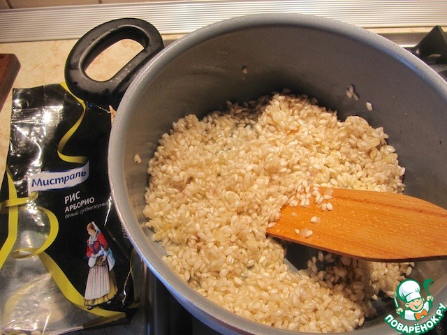 К луку добавить рис от Мистраль - белый среднезерный «Арборио» - прогреть его до прозрачности.