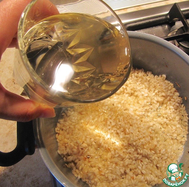 Влить вино и выпарить его в течение двух минут. После этого нужно начинать подливать бульон (потребуется оринтировочно 0,7 л, может чуть больше): постепенно, буквально по половнику или чуть больше. Задача в том, чтобы жидкость практически полностью впитывалась рисом до новой порции бульона - тогда ризотто получится правильной консистенции. В среднем рис готовиться минут 15-17+-, довести желательно до состояния al dente.