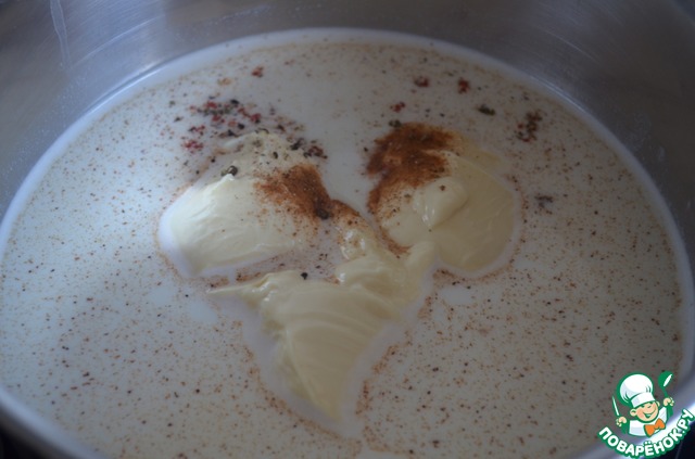 Растопить в кастрюле сливочное масло, добавить муку, немного обжарить. Развести с молоком и варить 3-4 минуты, при постоянном помешивании. Добавить плавленный сыр, мускатный орех, соль и перец, хорошо перемешать и варить ещё 2-3 минуты, до загустения.