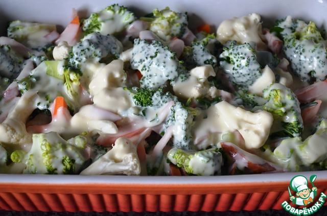 Подготовленные в форме для запекания овощи, залить горячим соусом.