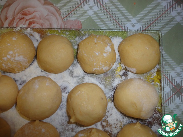 Тесто будет прилипать к рукам. Но у нас есть верный помошник - мука. Скатать шарики размером с грецкий орех. У меня получилось 24 шт.