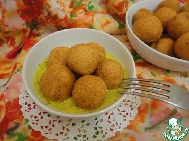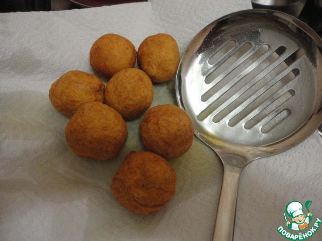 Обжарить в кипящем масле до золотистого цвета. Выкладывать на салфетку, чтобы стекло лишнее масло.