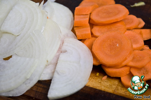 Лук нарезать полукольцами, морковь - кольцами. Пассеровать в растительном масле.